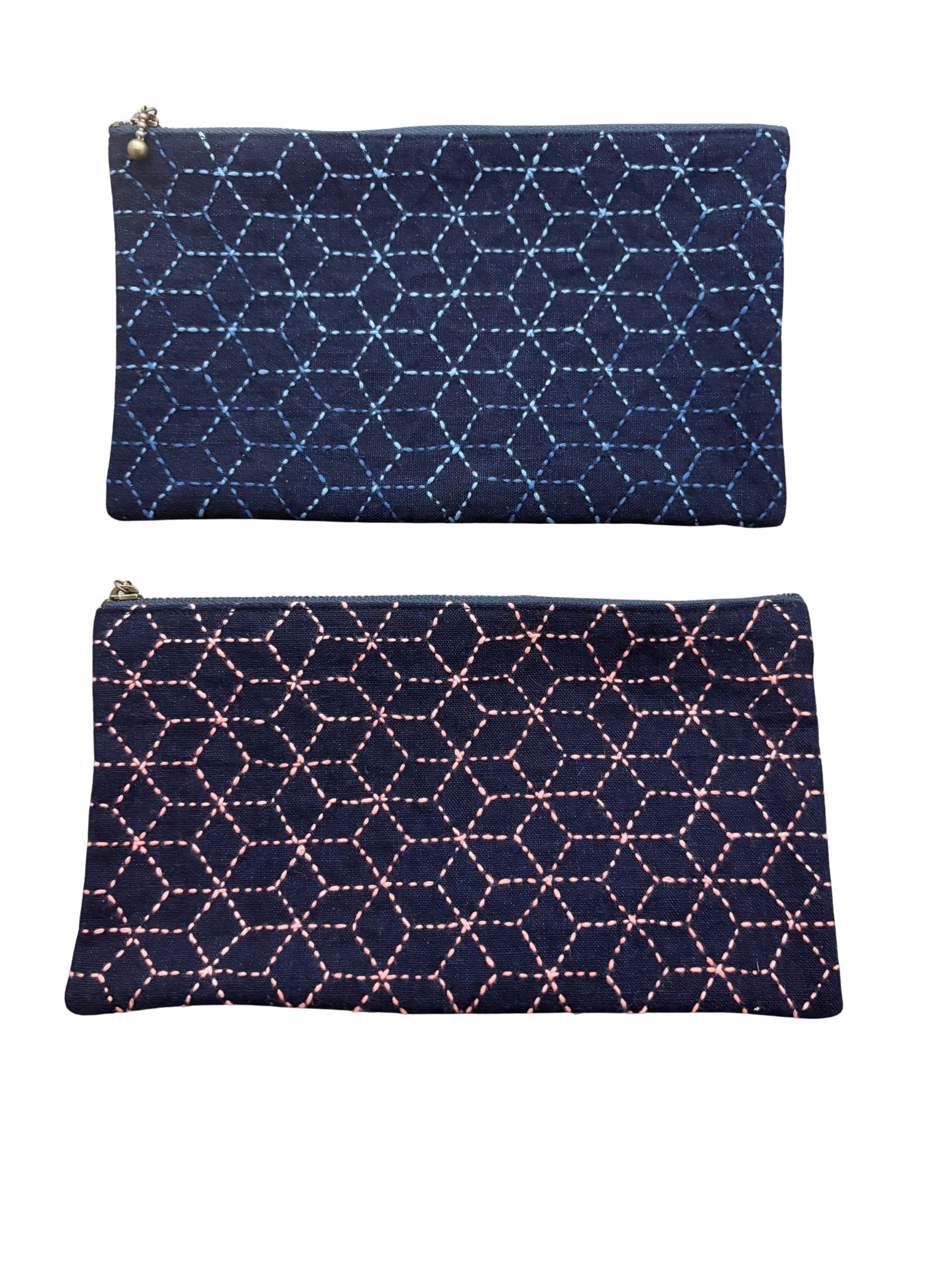 刺し子ファスナーポーチ 小物入れ 三つ箱つなぎ